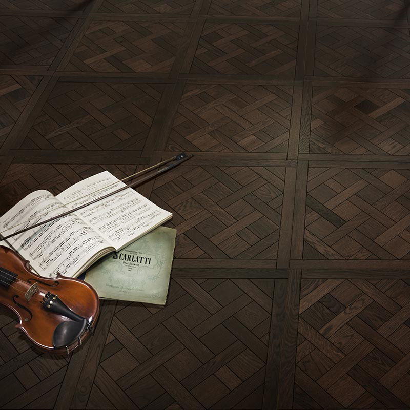 Рисунок сделан более изящным, чтобы модули можно было использовать не только в больших залах. Переплетения паркетных планок живут, играя и переливаясь в солнечном свете. Благодаря обработке особыми маслами, глубоко впитывающимися внутрь дерева, полы чрезвычайно интересны по рисунку. Интенсивный окрас древесины и необыкновенная выразительность ее совершенного узора, подчеркнутого брашированием, придадут помещению пафоса и экстравагантности.