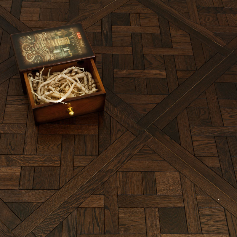 Рисунок сделан более изящным, чтобы модули можно было использовать не только в больших залах. Переплетения паркетных планок живут, играя и переливаясь в солнечном свете. Насыщенная густая палитра горького шоколада, подчеркнутый более темным цветом узор брашированного дуба делают пол экзотичным и стильным. Шикарная бархатистая поверхность древесины, достигнутая с помощью особой технологии обработки и применения специального масла, завораживает игрой мягких переливающихся бликов в лучах солнца, придавая интерьеру особый шарм. На фоне шоколадного пола гармонично смотрятся интерьеры в стиле готики или роскошном модерне, в современных модных стилях.