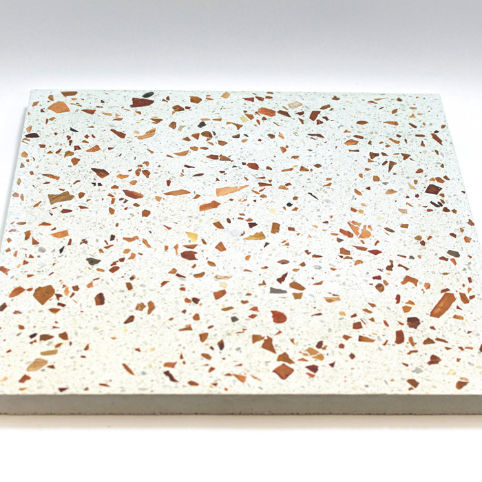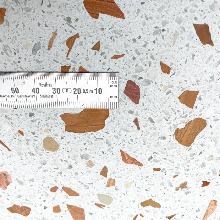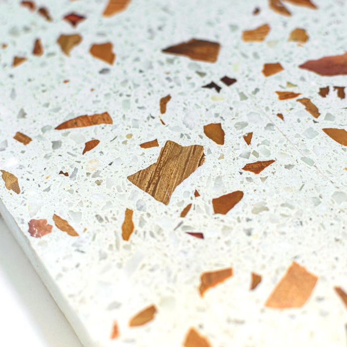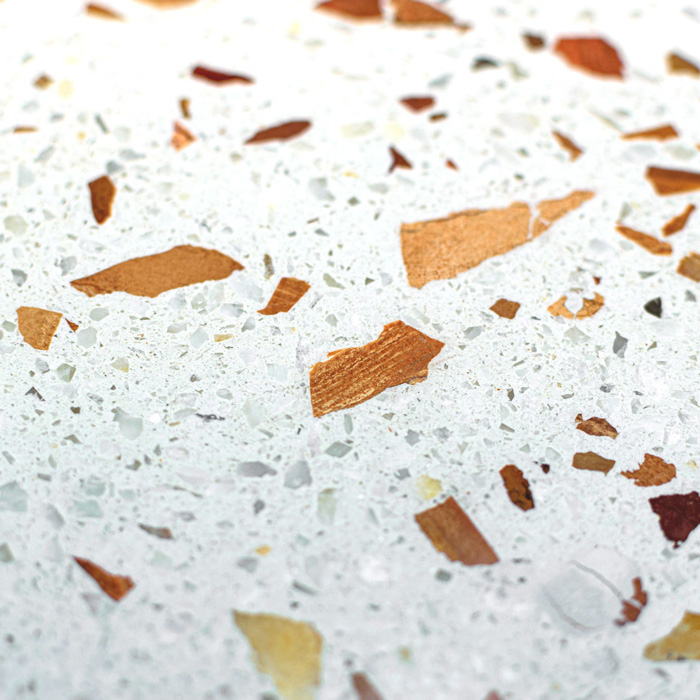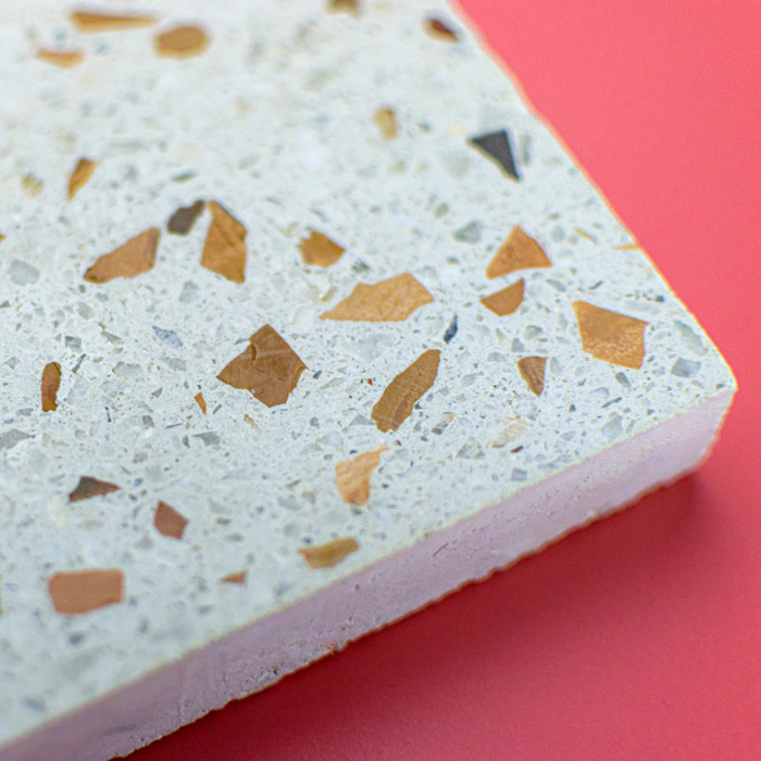 Terrazzo на основе мраморной крошки с вкраплениями крупного кремния. Имеет замечательный вид за счет уникальных прожилок и градиентов на камне.