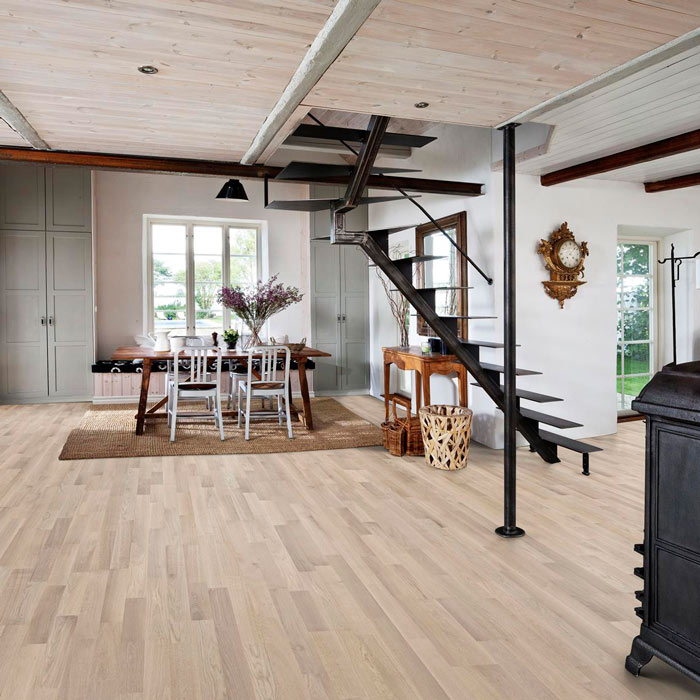 Создайте неповторимый интерьер с натуральной паркетной доской «Ментон». Твердая древесина экологически чистого дуба, выращенного в сертифицированных лесах Швеции, тонирована и обработана щеткой, чтобы сделать уникальный рисунок еще более отчетливым и выразительным. Финишное пятислойное покрытие белым лаком создает уникальный эффект легкой дымки, а также защищает древесину от механических повреждений и от губительного воздействия влаги.