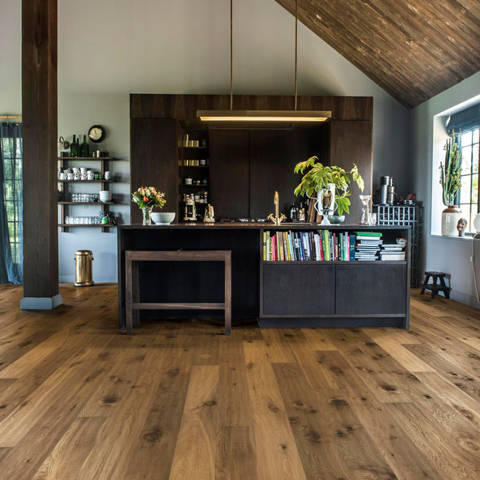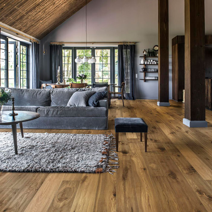 Механическая выборка волокон подчеркивает сучки, придавая полу потертый внешний вид.