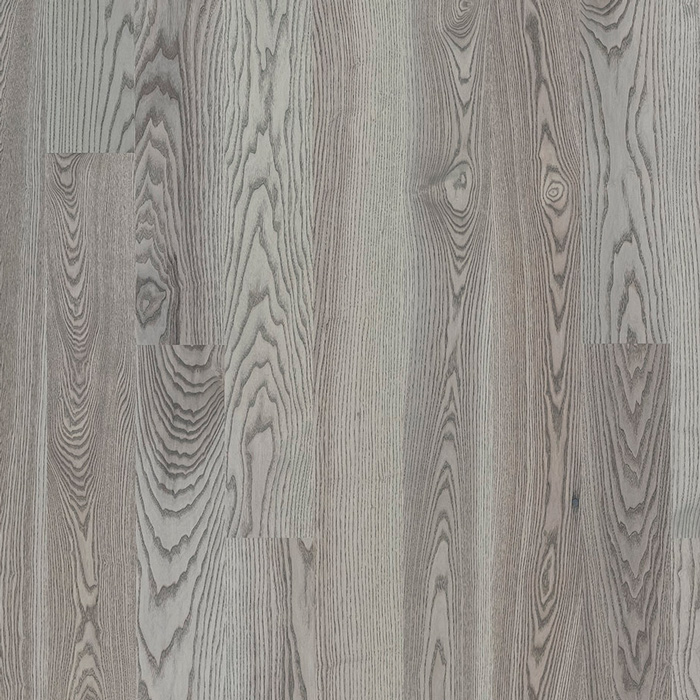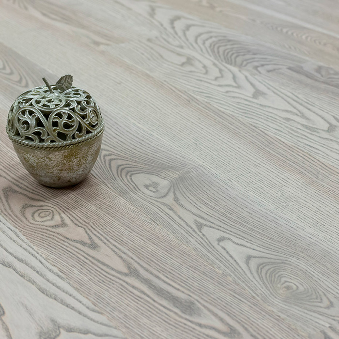 Однополосная брашированная паркетная доска из ясеня под серым матовым лаком. Допускается: сильный разнотон; редкие темные полосы; редкая синева; редкие сучки, в том числе не полностью зашпатлеванные.