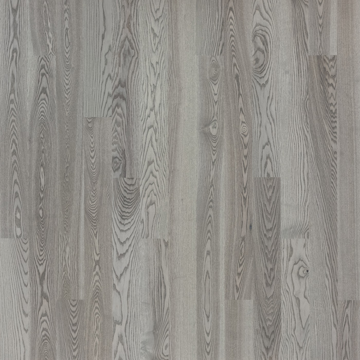 Однополосная брашированная паркетная доска из ясень под серым матовым лаком.