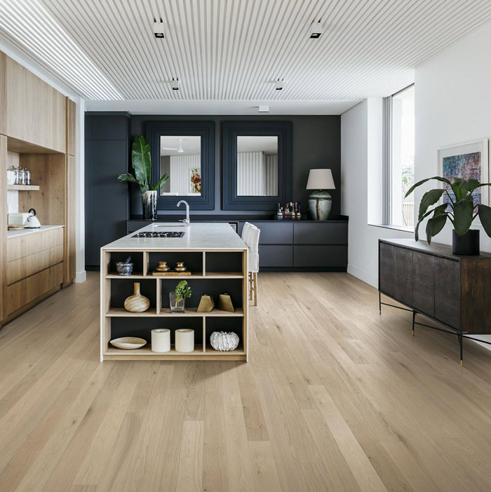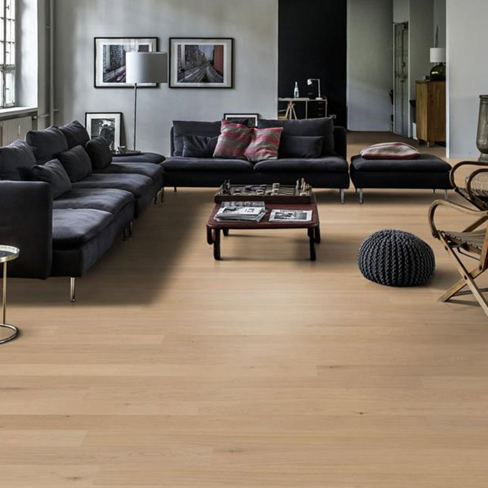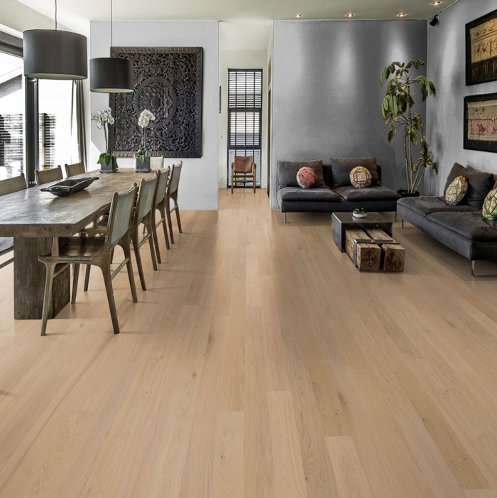Этот дубовой паркет из коллекции Канвас отличается матовым лаковым покрытием теплого белого цвета. В результате получается красивый нейтральный пол, напоминающий свежеспиленную древесину. Каждая доска тщательно обработана щеткой, что позволяет подчеркнуть естественную структуру древесины. Матовый лак устраняет блики, защищая дерево от повседневного износа. Четырехсторонняя микро-фаска подчеркивает классический формат доски.