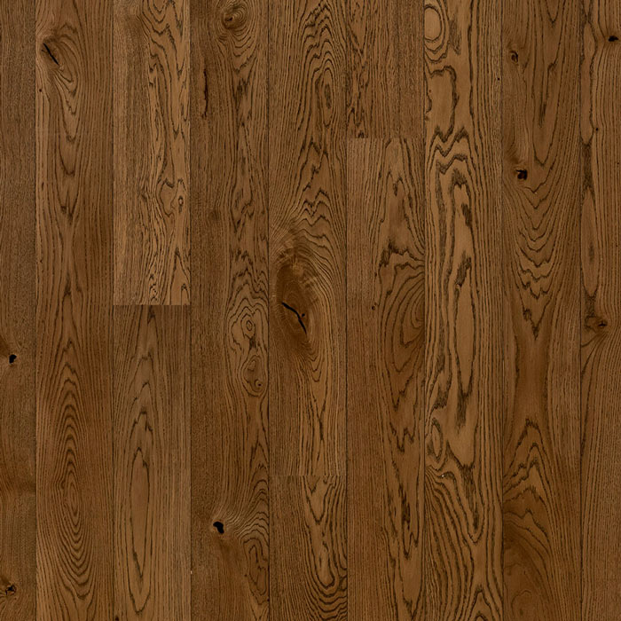Легко брашированная однополосная доска из дуба сортировки Кантри, покрыта коричневым маслом. Допускается: разнотон; редкая заболонь; сердцевинные лучи; темные полосы; сучки, в том числе не полностью зашпатлеванные.