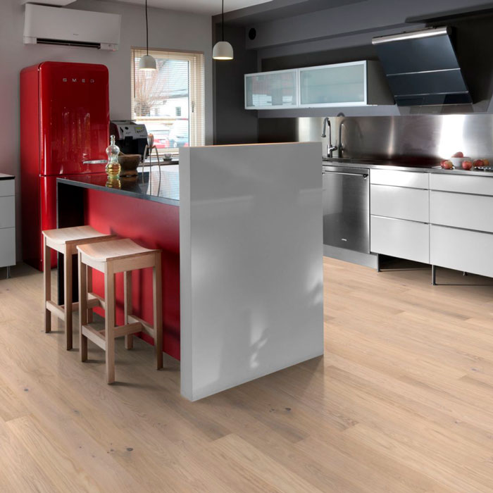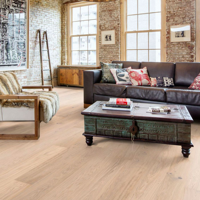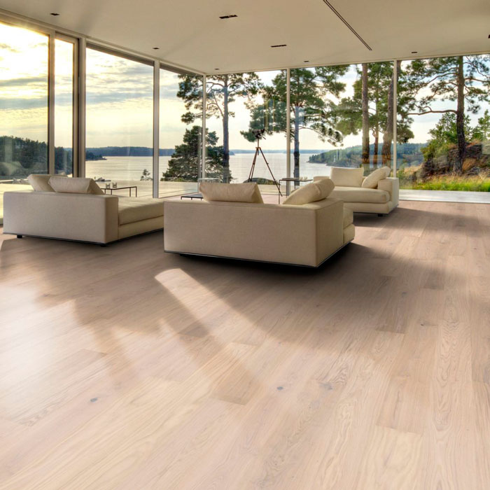 Однополосный дубовый декор из коллекции Люкс обработан щеткой и тонирован в туманно-белый цвет, что позволяет подчеркнуть все цветовые вариации древесины. Четырехсторонняя микро-фаска создаёт впечатление традиционного дощатого пола. Покрытие ультраматовым лаком подчёркивает естественные узоры древесины, создавая впечатление необработанного, недавно распиленного дерева. Кроме того, такое покрытие эффективно устраняет блики и защищает пол от ежедневного износа.Допускаются все возможные в природе вариации цвета древесины – от светлого до тёмно-коричневого. Может встречаться заболонь, зашпатлёванные сучки и трещины могут различаться по размеру и количеству.