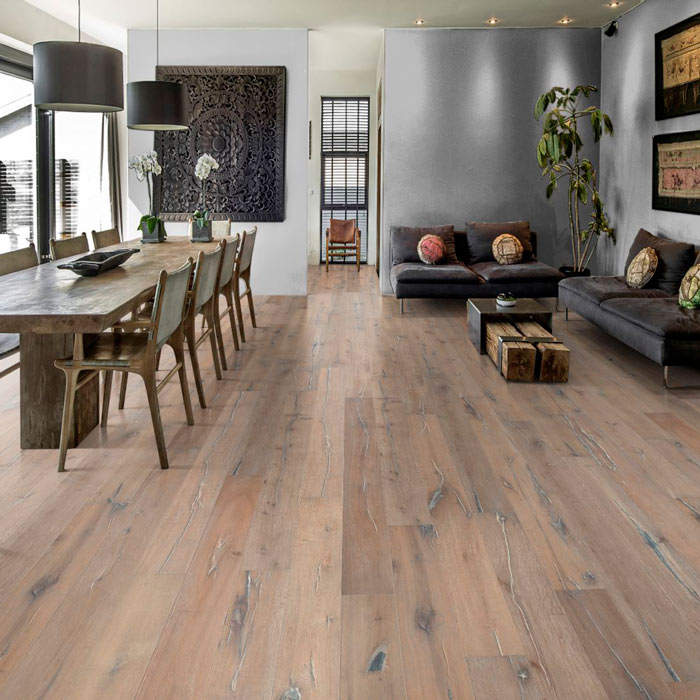 Белое масло на поверхности этой слегка копченой однополосной доски, а также разнообразие сучков и трещин выгодно подчеркивают ее рустикальный внешний вид. Каждая доска бережно обработана щеткой, чтобы подчеркнуть уникальную текстуру древесины. Четырехсторонняя фаска придает паркету классический вид и приятные тактильные ощущения. В сочетании со специальной ручной обработкой поверхности это создает впечатление того, что доска пролежала в помещении уже много лет. После укладки следует покрыть доски сатиновым маслом. Допускается любое естественное изменение цвета от