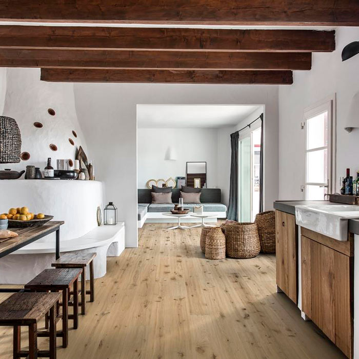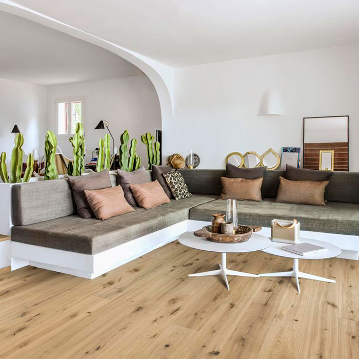 Прозрачная белая тонировка этой однополосной дубовой доски из коллекции Смоланд придает ей природную тусклость. Каждая доска тщательно обработана вручную, что подчеркивает сучки и гармоничный внешний вид пола. Четырехсторонняя фаска по краям усиливает классический вид и ощущение цельной доски. Аккуратная брашировка каждой доски показывает особенности волокон и подчеркивает натуральную текстуру древесины.Допускаются любые естественные вариации цвета от светло-коричневого до темно-коричневого, а также заболонь. Для декора характерны очень крупные плотные и черные сучки, а также трещины. Сучки, трещины и шпатлевки могут быть различных размеров и в разном количестве.
