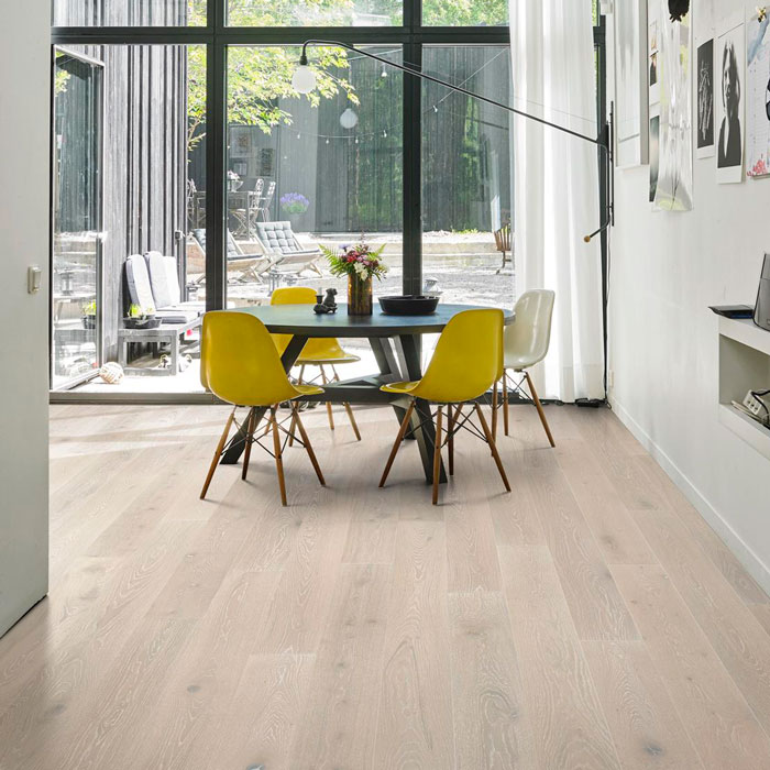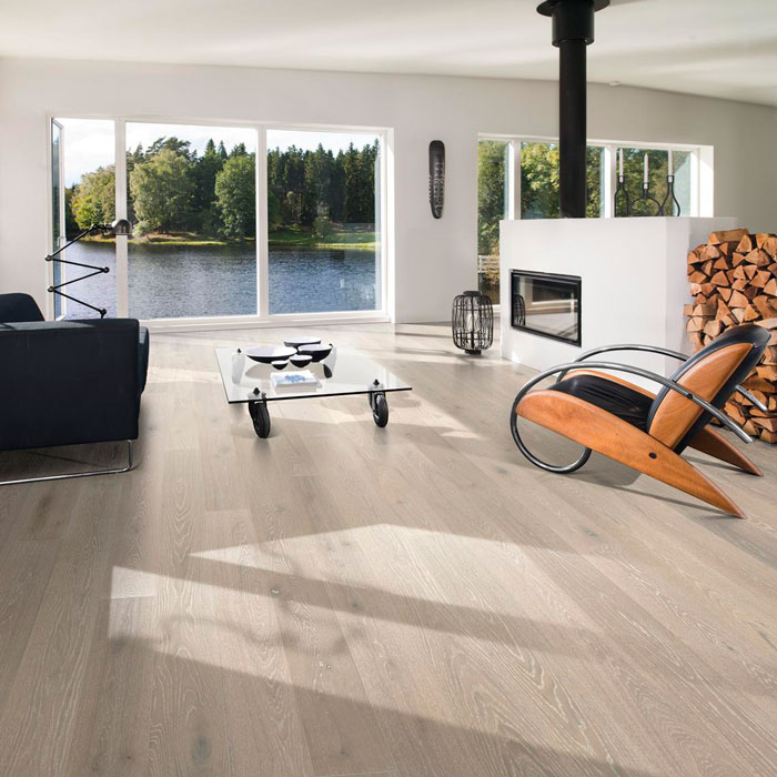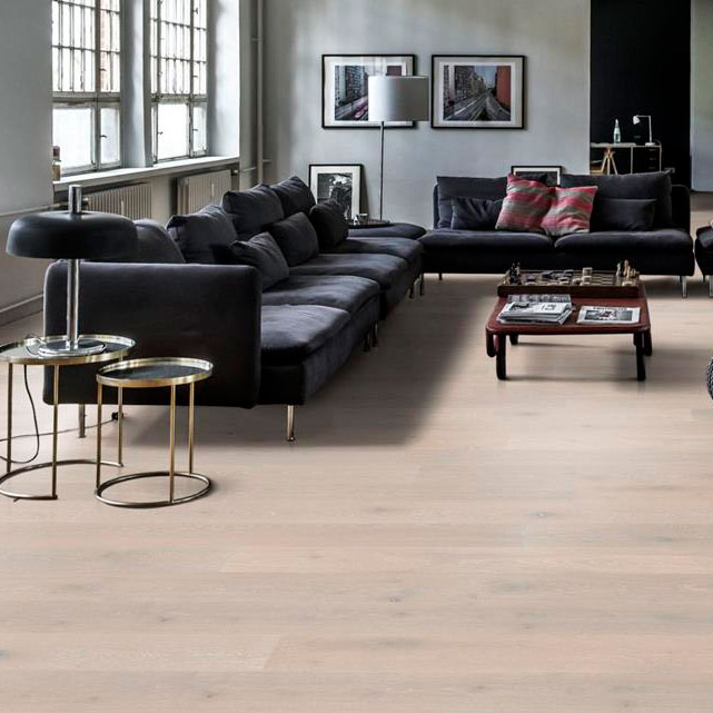 Дуб Снег Новая Классика - пол, покрытый белым лаком через который отчетливо видна натуральная структура дерева и прослеживается вариация цветов, возможны темные и белые сучки. Поверхность брашированная и покрыта матовым лаком.Допускается любое естественное изменение цвета от светлого до темно-коричневого. Возможно образование заболони. Для продукции характерны крупные плотные и черные сучки и прожилки. Сучки и прожилки могут быть различных размеров и в различном количестве.Покрытие пятнами. С течением времени отмечается изменение окраски.