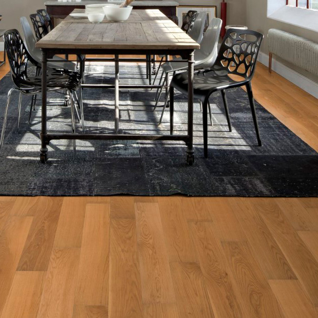 Однополосная дубовая доска в светло-коричневых тонах покрыта матовым лаком. Декор с большими вариациями цвета и умеренное количество сучков. Допускается: заболонь; сердцевинные лучи; живые сучки; зашпатлеванные черные сучки диаметром до 12 мм; зашпатлеванные трещины (средняя ширина не больше 7 мм); групповые булавочные сучки; червоточины (Ø до 2 мм).