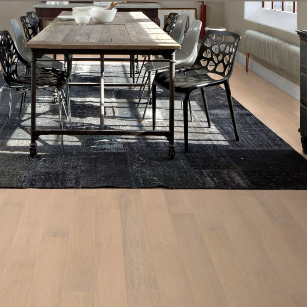 Однополосная дубовая доска чистой сортировки в светлых тонах. Поверхность обработана щеткой и покрыта матовым лаком. Полупрозрачный белый с умеренным контрастом, пропускает сквозь себя сияние теплых древесных оттенков. Для данного декора используется отборное сырье. Допускаются умеренные вариации цвета древесины, сердцевинные лучи, живые сучки и маленькие, черные сучки (Ø до 7 мм), а также редкие групповые булавочные сучки и червоточины (Ø до 2 мм).