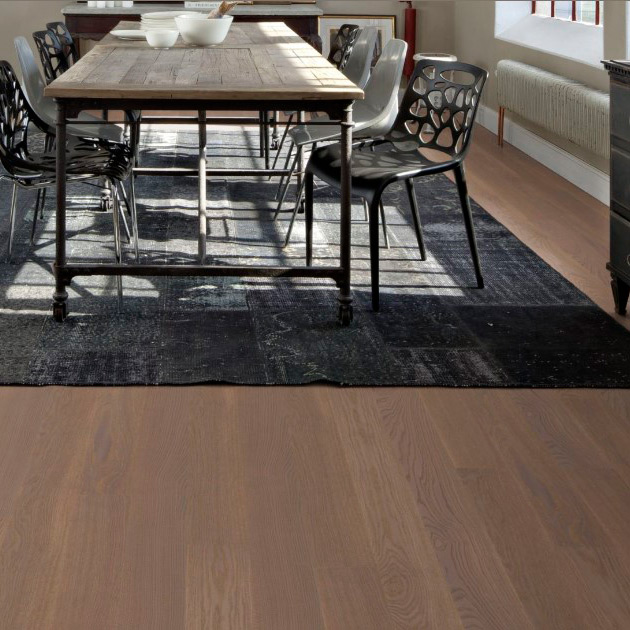 Однополосная дубовая доска чистой сортировки обработана щеткой и покрыта полупрозрачным белым лаком с перламутровыми пигментами. Лак пропускает сквозь себя сияние более теплых оттенков и слегка играет в зависимости от угла зрения и освещения. Для данного декора используется отборное сырье. Допускаются умеренные вариации цвета древесины, сердцевинные лучи, живые сучки и маленькие, черные сучки (Ø до 7 мм), а также редкие групповые булавочные сучки и червоточины (Ø до 2 мм).