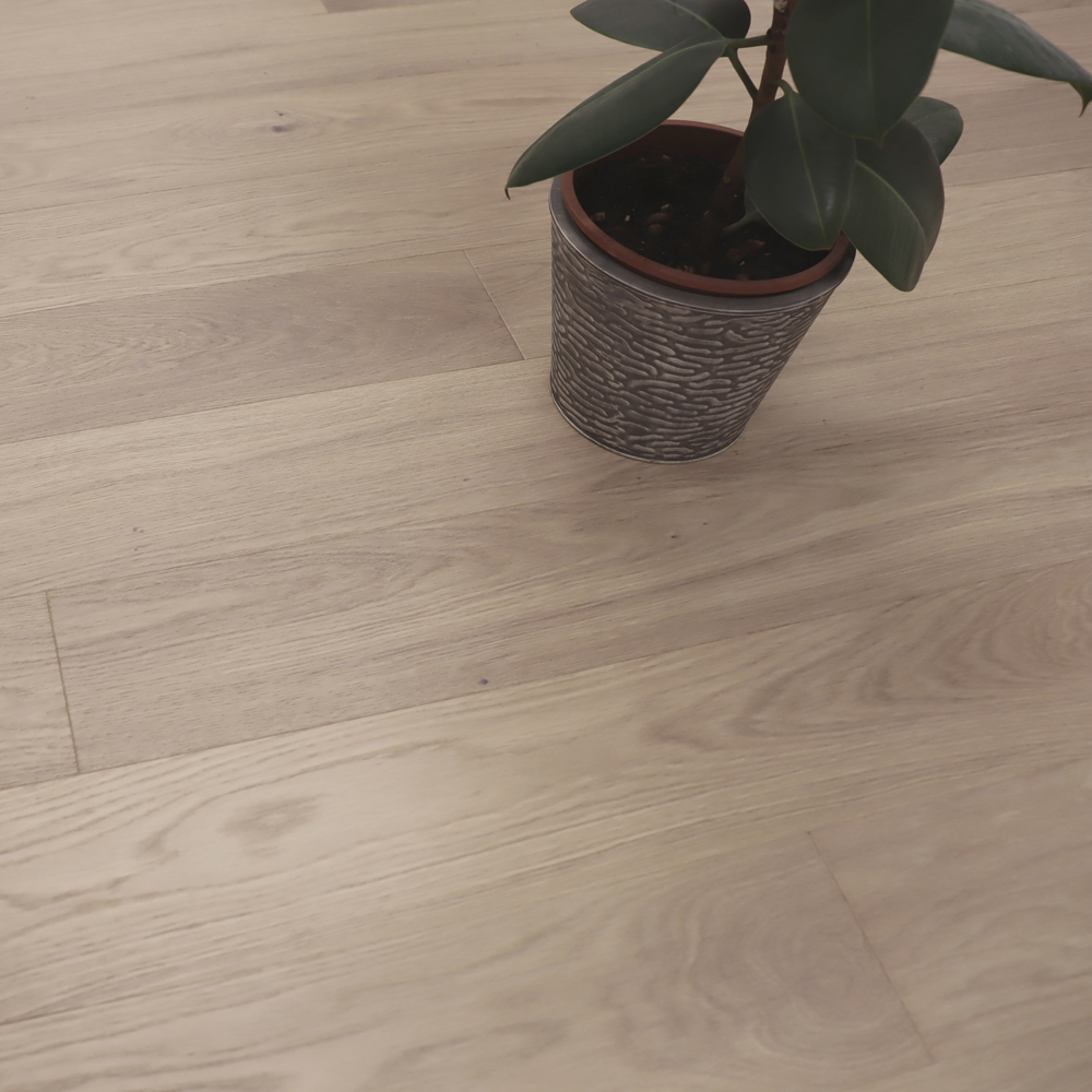 Доска из дуба, обработанная щеткой и покрытая матовым лаком. Естественные узоры и умеренные вариации оттенков