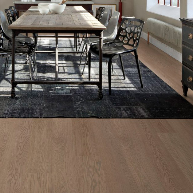 Модный тепло-серый паркет обработан щеткой и покрыт матовым лаком. Четырехсторонняя фаска по краям усиливает классический вид цельной доски.