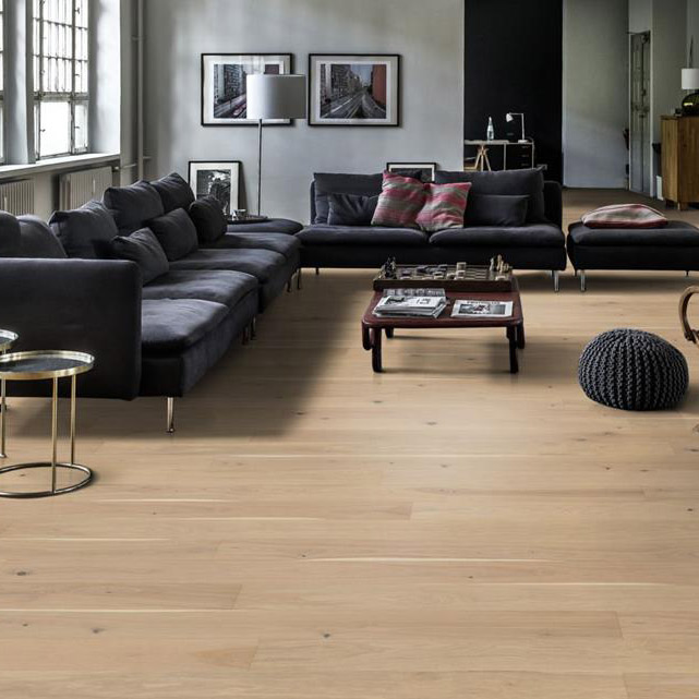 Полупрозрачный белый тонированный и брашированный однополосный дубовый пол из коллекции Люкс уравновешивает светлые и тёмные контрасты древесины, мягко просвечивая тёплые дубовые тона. Четырехсторонняя микро-фаска создаёт впечатление традиционного дощатого пола. Покрытие ультраматовым лаком подчёркивает естественные узоры древесины, создавая впечатление необработанного, недавно распиленного дерева. Кроме того, такое покрытие эффективно устраняет блики и защищает пол от ежедневного износа. Допускаются все возможные в природе вариации цвета древесины – от светлого до тёмно- коричневого. Может встречаться заболонь, зашпатлёванные сучки и трещины могут различаться по размеру и количеству.