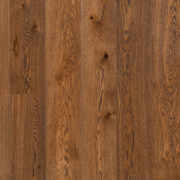Легко брашированная однополосная доска из дуба, покрыта коричневым маслом. Допускается: разнотон; редкая заболонь; темные полосы; сердцевинные лучи; не полностью зашпатлеванные сучки.