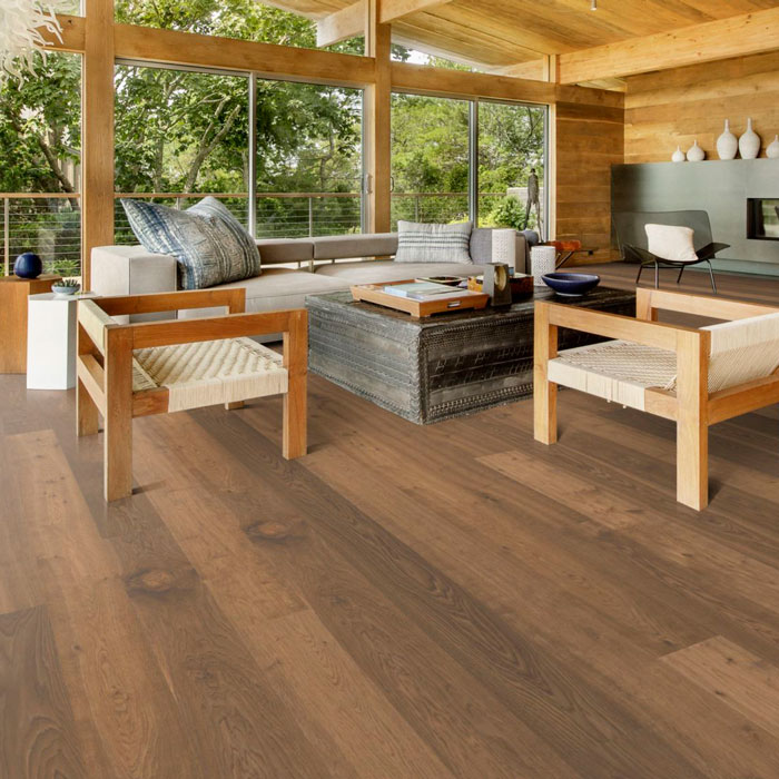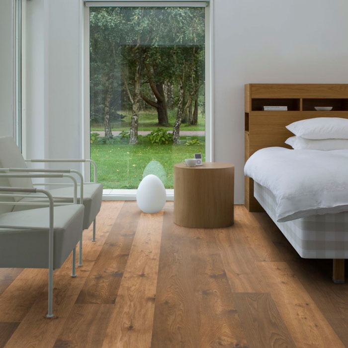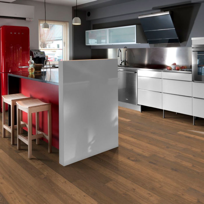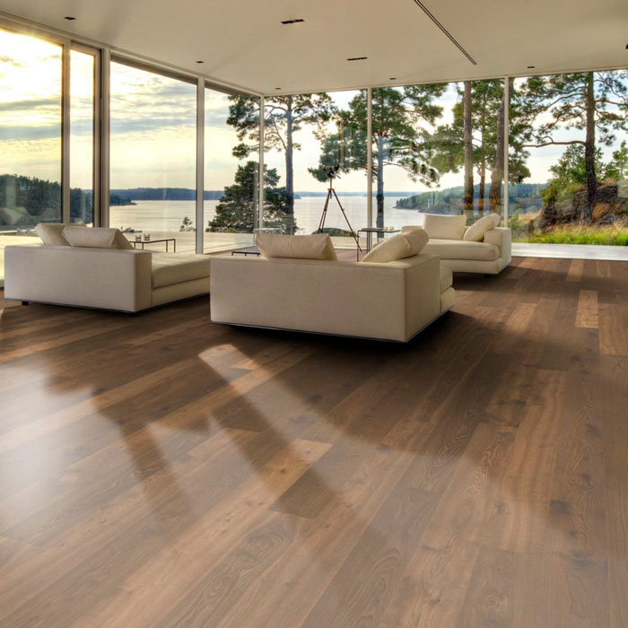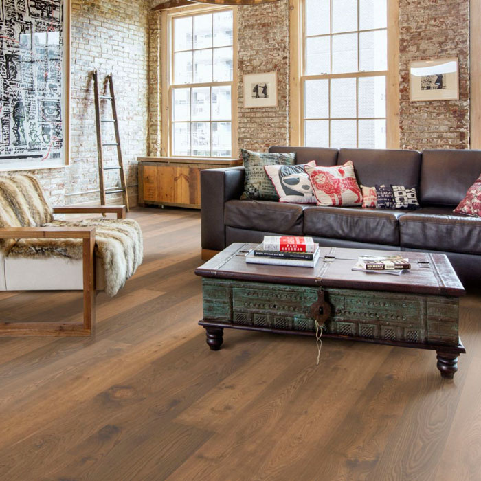 Насыщенный земельный цвет однополосного декора из коллекции Люкс получен с помощью специальной обработки «копчение», которая подчеркивает естественные особенности древесины. Четырехсторонняя микро-фаска создаёт впечатление традиционного дощатого пола. Каждая доска тщательно обработана щёткой до совершенства, в результате чего из тёмных оттенков возникает вневременная рустикальная выразительность. Покрытие ультраматовым лаком подчёркивает естественные узоры древесины, создавая впечатление необработанного ,недавно распиленного дерева. Кроме того, такое покрытие эффективно устраняет блики и защищает пол от ежедневного износа.Допускаются все возможные в природе вариации цвета древесины – от светлого до тёмно-коричневого. Может встречаться заболонь, зашпатлёванные сучки и трещины могут различаться по размеру и количеству. Обработка «Копчение» усиливает естественные цветовые вариации и создает более сильный контраст между светлыми и темными участками.