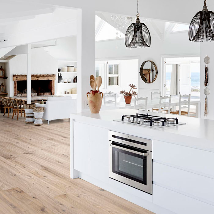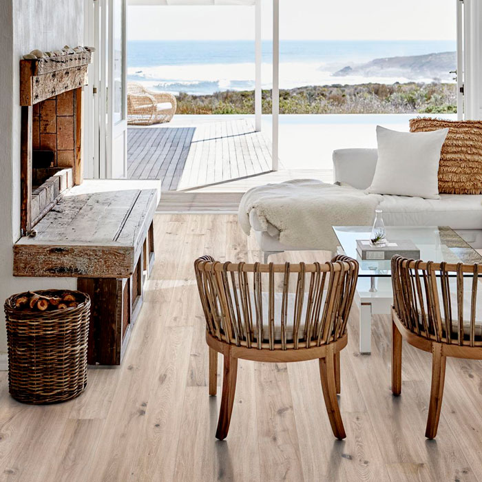 Состаренный дуб дымчато-белого цвета с большими сучками и механической выборкой волокон.
