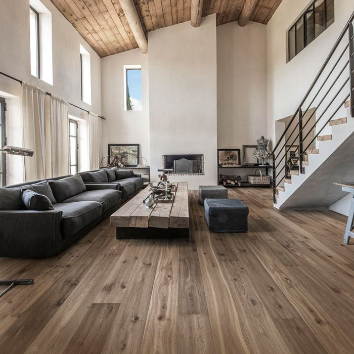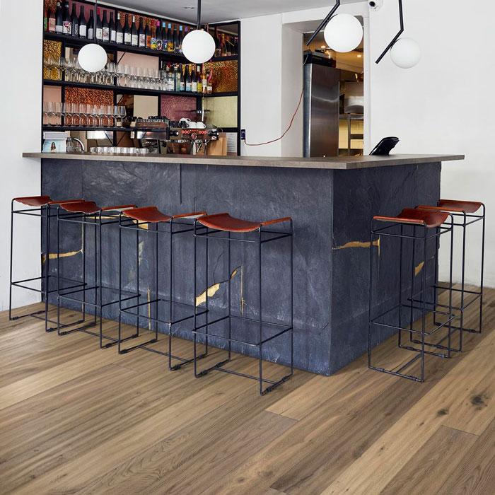 Встреча древесины и минералов холодных оттенков кристаллов соли и морских водорослей. Обработанная механически динамичная поверхность вторит структуре, придавая каждой плашке потертый вид.]]