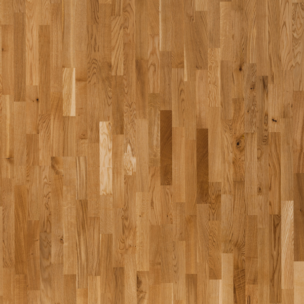 Трехполосная доска из дуба под лаком. Допускается: сильный разнотон; заболонь; сердцевинные лучи; темные полосы; редкая синева; редкие сросшиеся сучки; групповые булавочные сучки.]]
