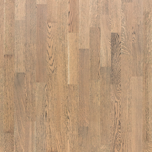 Легко брашированная трехполосная доска из дуба, покрыта белым маслом. Допускается: сильный разнотон; заболонь; сердцевинные лучи; темные полосы; редкая синева; редкие сросшиеся сучки; групповые булавочные сучки.