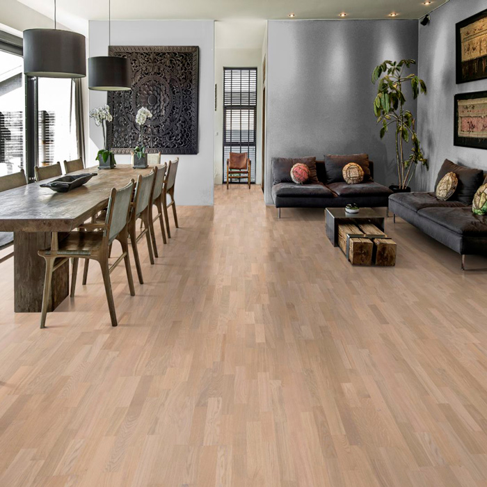 3-полосный дубовый декор из коллекции Люмен обработан щеткой и тонирован в туманно-белый цвет, что позволяет подчеркнуть все цветовые вариации древесины. Покрытие ультраматовым лаком подчёркивает естественные узоры древесины, создавая впечатление необработанного ,недавно распиленного дерева. Кроме того, такое покрытие эффективно устраняет блики и защищает пол от ежедневного износа.Возможны небольшие цветовые вариации. Допускаются мелкие сучки в ограниченном количестве.