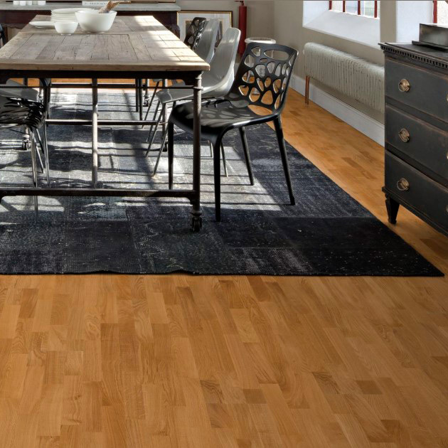 Трехполосный дубовый паркет под полуматовым лаком, подчёркивает естественные узоры древесины, дополняя классический традиционный интерьер. Для данного декора используются ламели с различными вариациями по текстуре и оттенкам. Допускаются заболонь, сердцевинные лучи и единичные сучки диаметром не более 10 мм (темные 6 мм), а также групповые булавочные сучки и редкие червоточины.