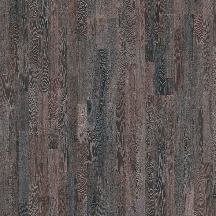 Темно-коричневый паркет из дуба обработан щеткой и покрыт серебристым маслом. Обработка маслом по технологии "Stonewash" подчеркивает текстуру древесины и придает полу неповторимый внешний вид. Декор с сучками. Допускаются естественные вариации цвета древесины. Для продукции характерны плотные и черные зашпатлеванные сучки. а также групповые булавочные сучки и червоточины. Диаметр шпатлевок не более 15 мм. В шпатлевке встречаются неровности и отверстия.