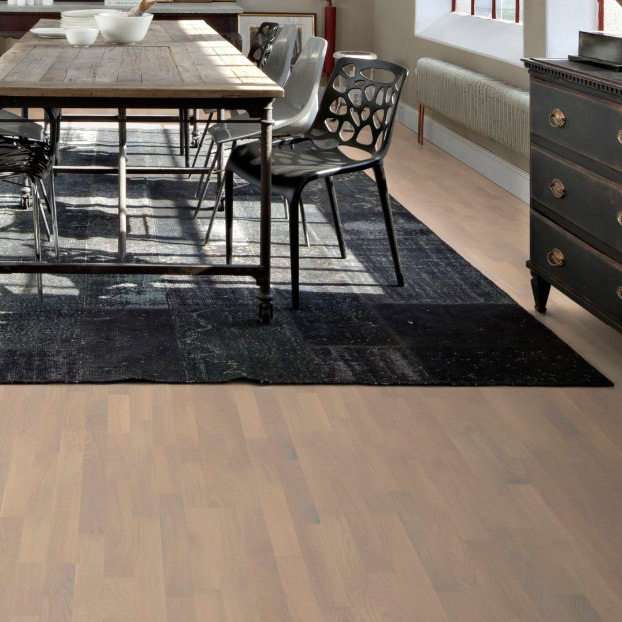 Модный тепло-серый паркет обработан щеткой и покрыт матовым лаком. Трехполосный дизайн хорошо подходит для комнат небольшого размера, визуально увеличивая пространство.