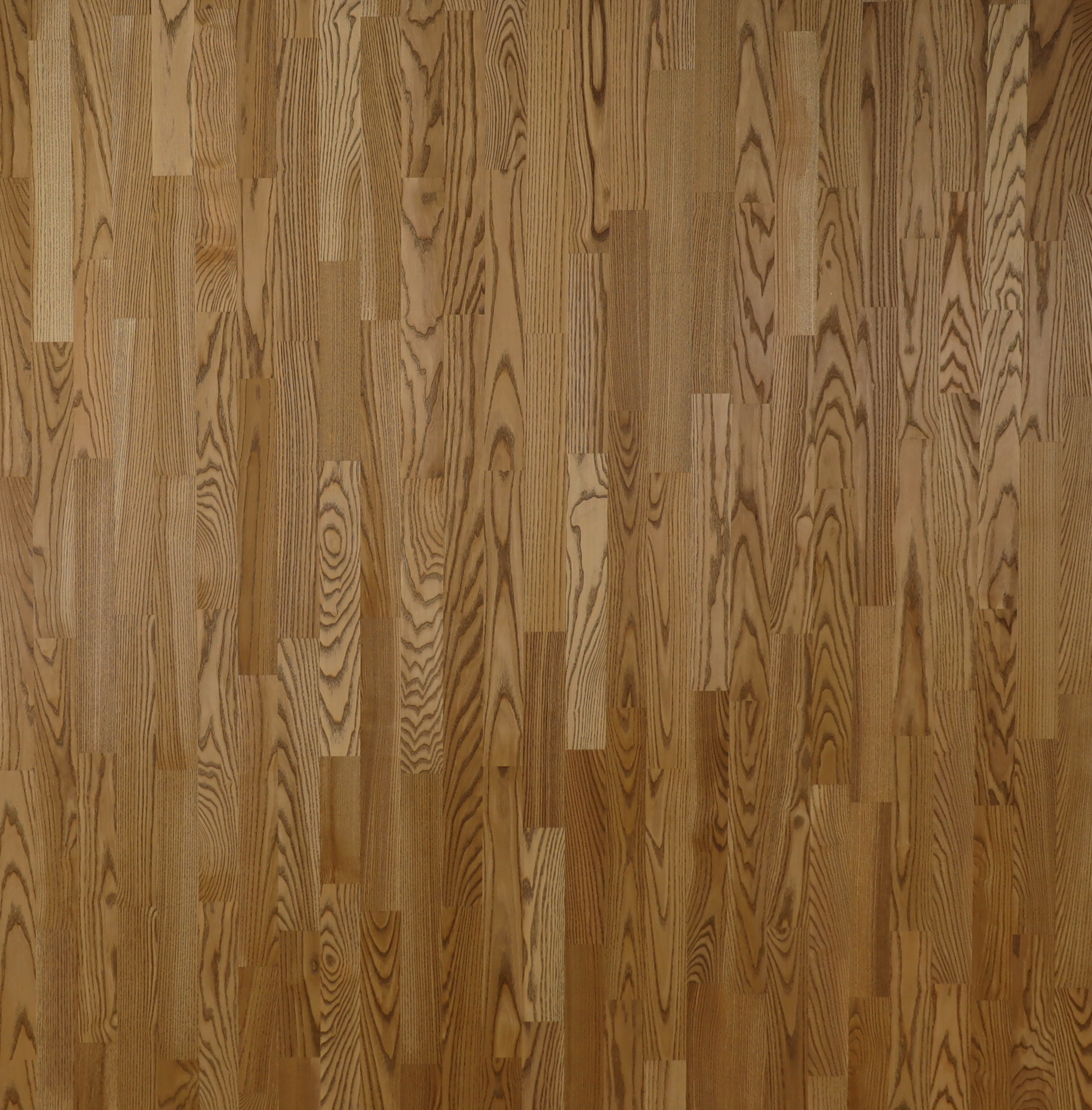 Классическая трехполосная доска из ясеня под светло-коричневым маслом. Допускается: сильный разнотон, редкие темные полосы и следы, редкая синева, редкие сучки, в том числе черные и зашпатлеванные