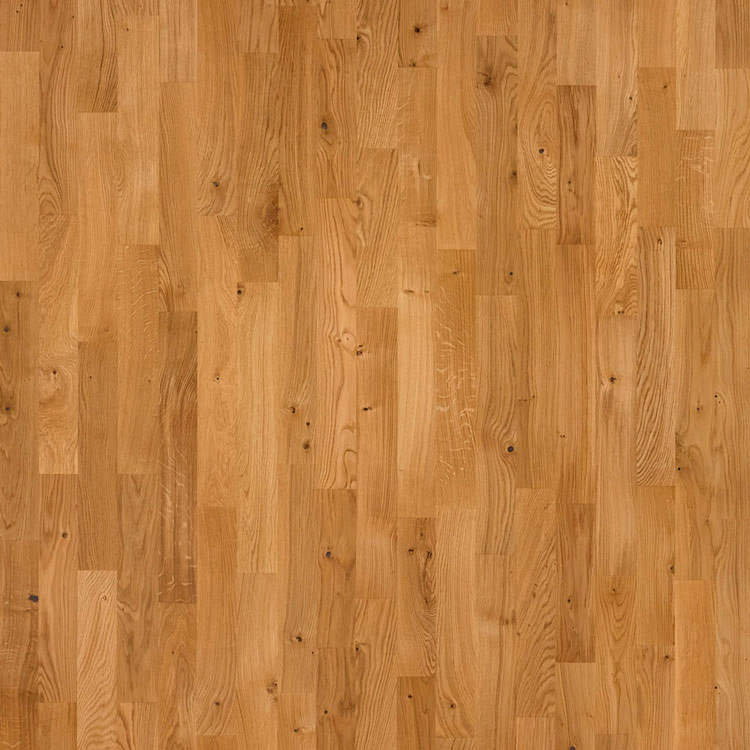 Трехполосная доска из дуба в стиле Кантри, покрыта лаком. Допускается: разнотон; редкая заболонь; темные полосы; сердцевинные лучи; сросшиеся и зашпатлеванные сучки.