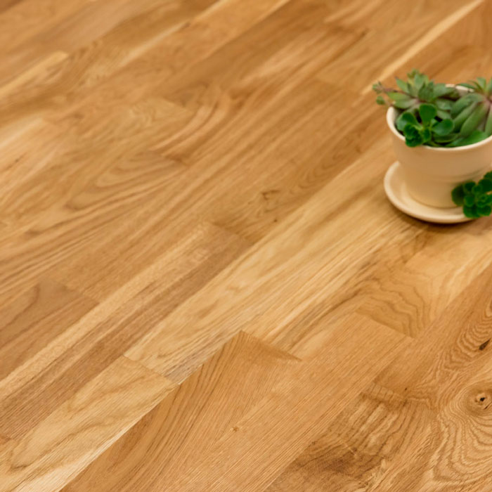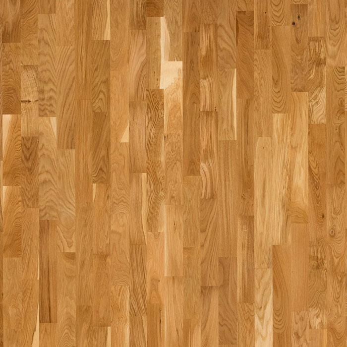 Трехполосная доска из дуба под лаком. Допускается: сильный разнотон; заболонь; сердцевинные лучи; темные полосы; редкая синева; редкие сучки, в том числе черные и зашпатлеванные; групповые булавочные сучки.
