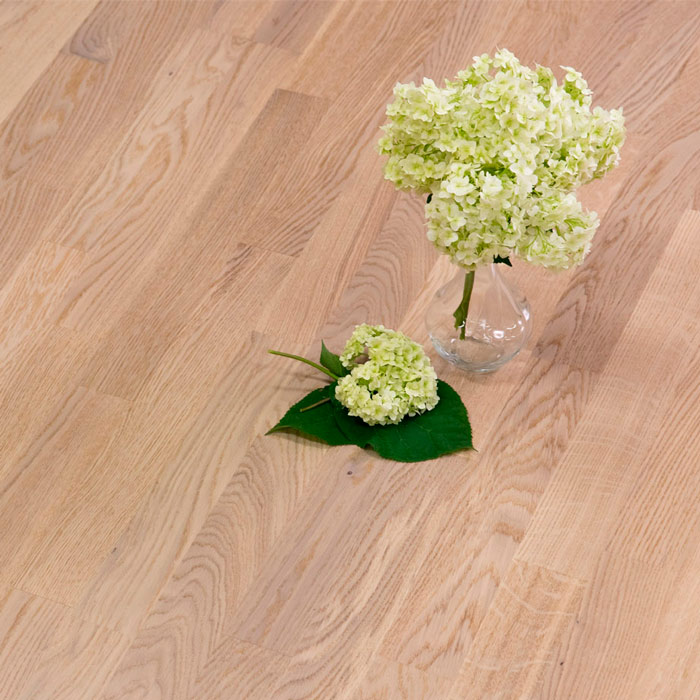 Классическая трехполосная доска из дуба под белым матовым лаком. Допускается: легкий разнотон; редкая заболонь; темные полосы; сердцевинные лучи; редкие сучки, в том числе черные и зашпатлеванные; групповые булавочные сучки.