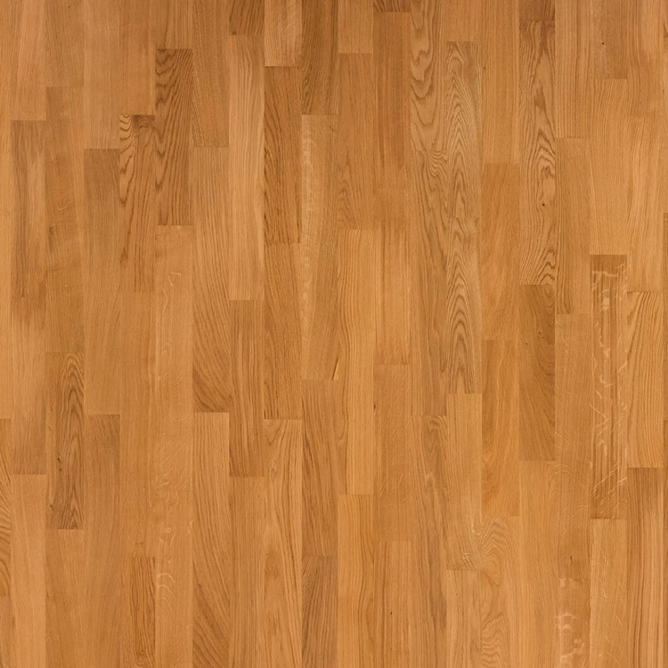 Классическая трехполосная доска из отборного дуба под золотистым лаком. Допускается: легкий разнотон; редкая заболонь; темные полосы; сердцевинные лучи; редкие сросшиеся сучки; групповые булавочные сучки.