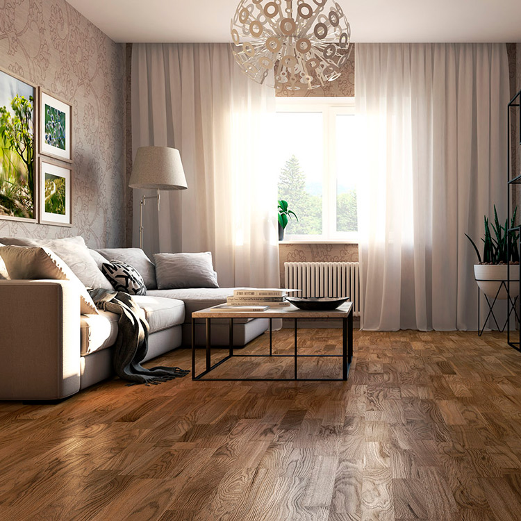 Классическая трехполосная доска из дуба под коричневым матовым лаком. Допускается: разнотон; заболонь; сердцевинные лучи; темные полосы; редкая синева; редкие сросшиеся сучки; групповые булавочные сучки.