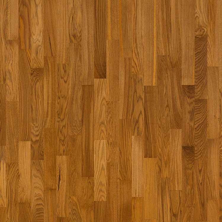 Классическая трехполосная доска из дуба под коричневым матовым лаком. Допускается: разнотон; заболонь; сердцевинные лучи; темные полосы; редкая синева; редкие сросшиеся сучки; групповые булавочные сучки.