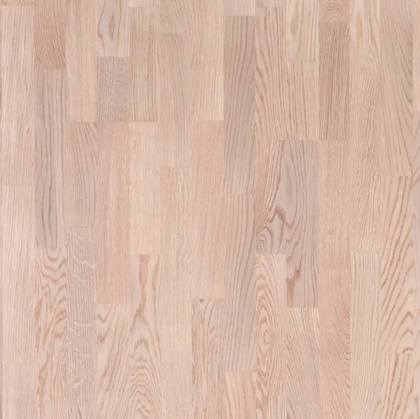 Классическая трехполосная доска из отборного дуба под белым матовым лаком. Допускается: легкий разнотон; редкая заболонь; темные полосы; сердцевинные лучи; редкие сросшиеся сучки; групповые булавочные сучки.