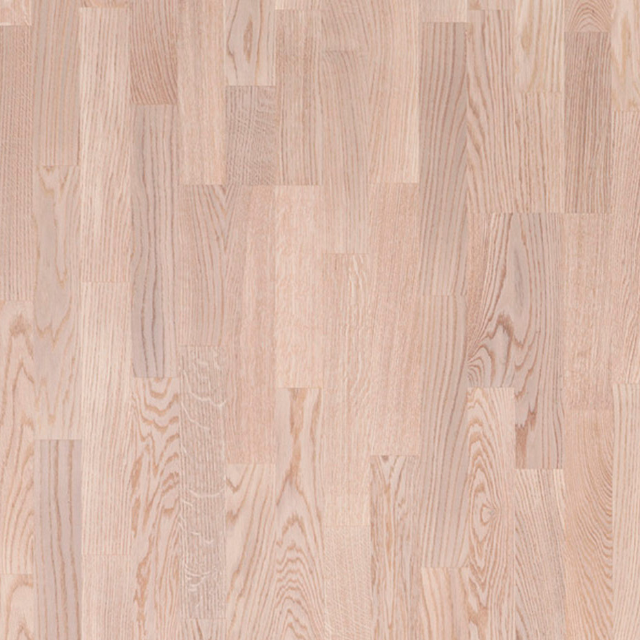 Классическая трехполосная доска из отборного дуба под белым матовым лаком. Допускается: легкий разнотон; редкая заболонь; темные полосы; сердцевинные лучи; редкие сросшиеся сучки; групповые булавочные сучки.