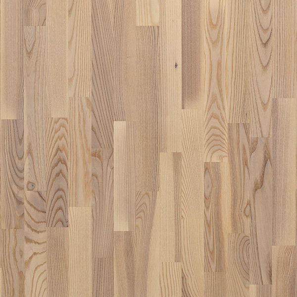 Классическая трехполосная доска из ясеня под белым матовым лаком. Допускается: сильный разнотон; редкие темные полосы и следы; редкая синева; редкие сросшиеся сучки.]]